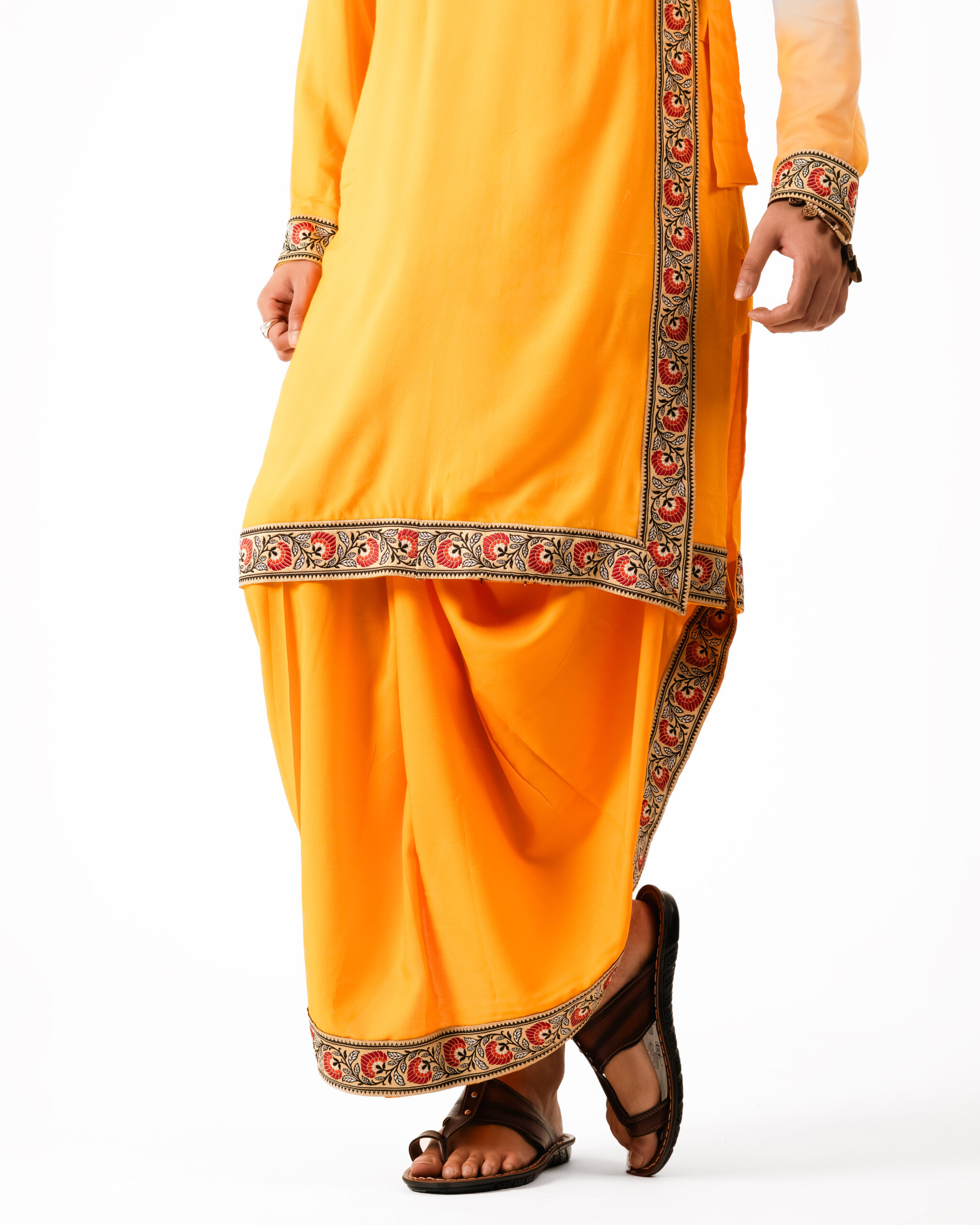 Perfect for cultural gatherings, festive occasions, or ceremonial celebrations, this full set allows freedom of movement while showcasing craftsmanship at every fold. Each piece is a testament to Dharniya’s philosophy of “living heritage in motion,” where every drape, motif, and thread tells a story of artistry, culture, and timeless elegance.