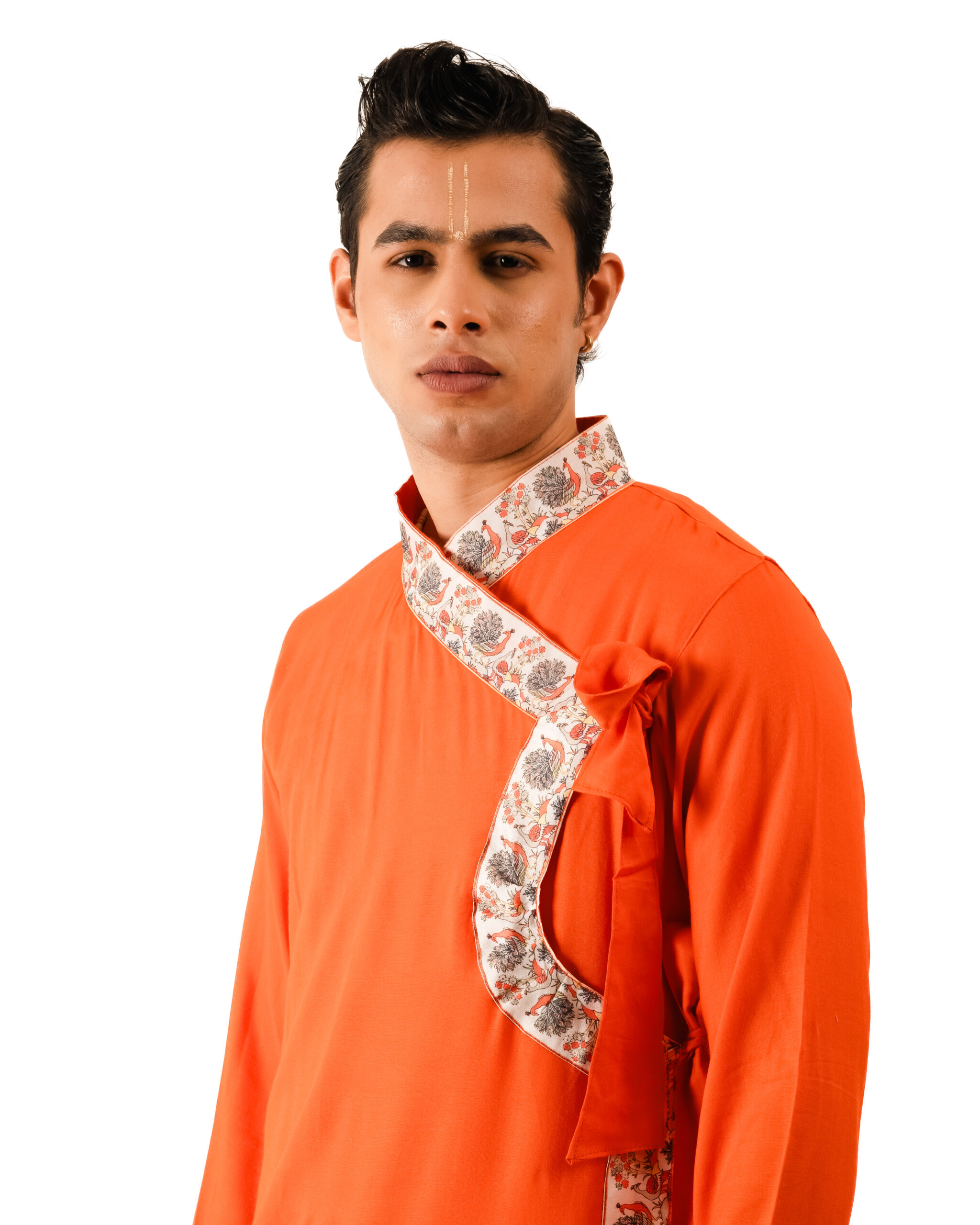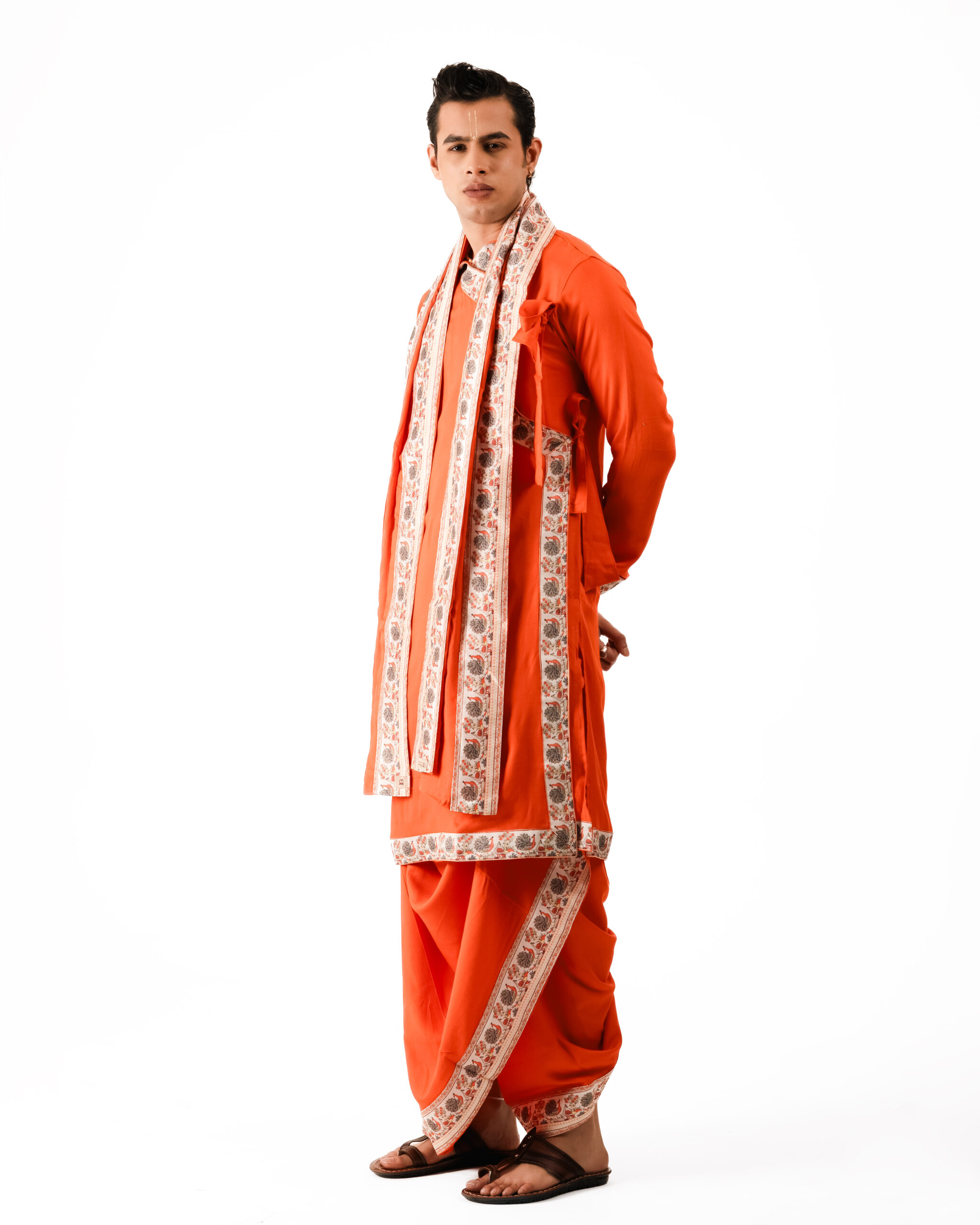 The Kanaka Set radiates festive warmth and tradition — crafted in smooth Bagalpuri rayon for comfort, elegance, and effortless movement. The vibrant orange, paired with a handcrafted border of poised peacock pairs, symbolizes auspicious beginnings, beauty, and companionship. This three-piece ensemble includes a dhoti, dupatta, and structured bagalbandhi top, blending time-honored silhouettes with contemporary grace. Perfect for ceremonies, celebrations, or statement heritage style.