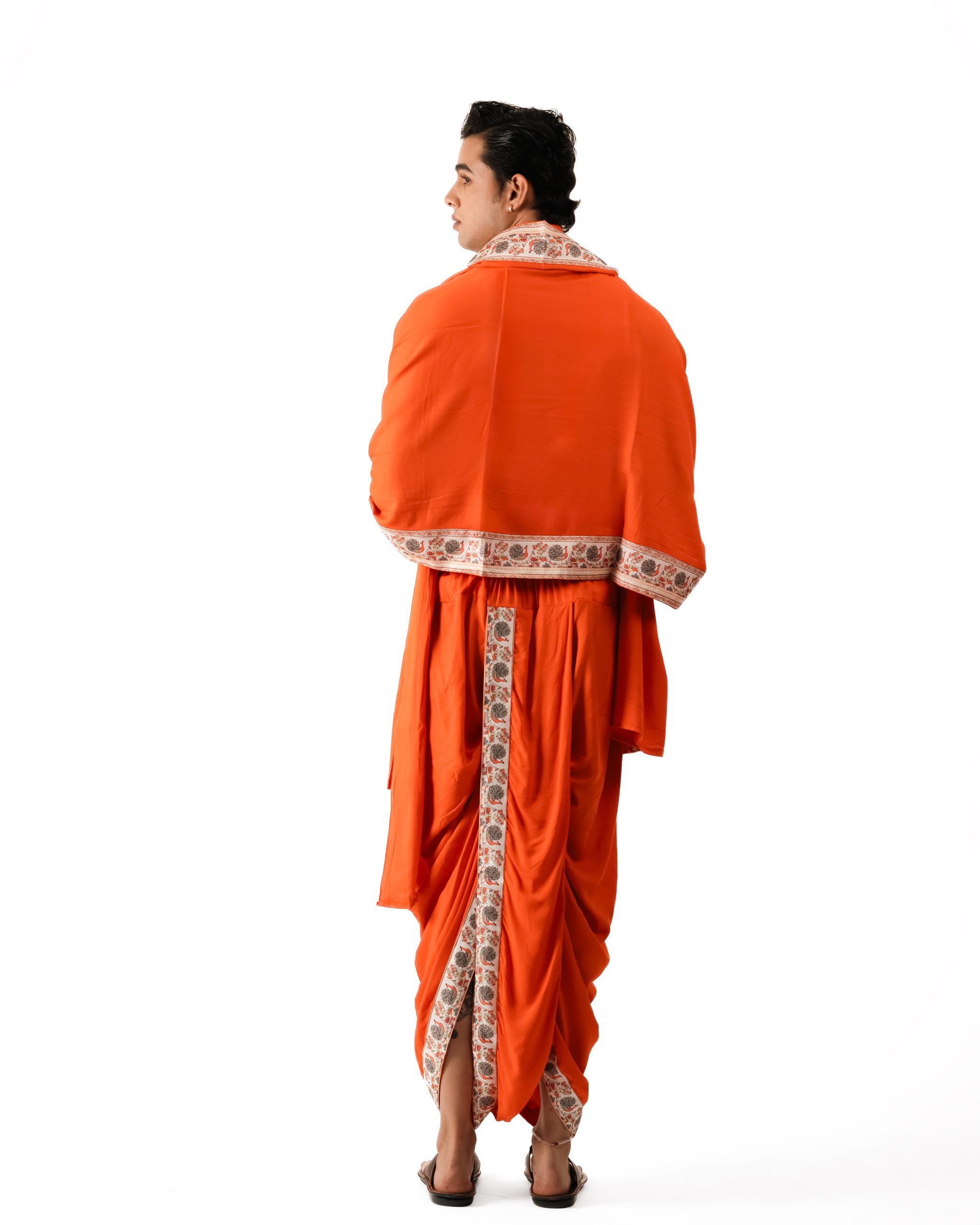 इस सेट में धोती और दुपट्टा हैं। चिकने बगालपुरी रेयॉन कपड़े से बना यह सेट पहनने में बेहद आरामदायक है। इसके नारंगी रंग और किनारी पर बने मोर के जोड़े ऊर्जा, सुंदरता और प्रेम का प्रतीक हैं। यह सेट त्योहारों, सांस्कृतिक आयोजनों या परंपरा से जुड़ी खास शान के लिए उपयुक्त है।