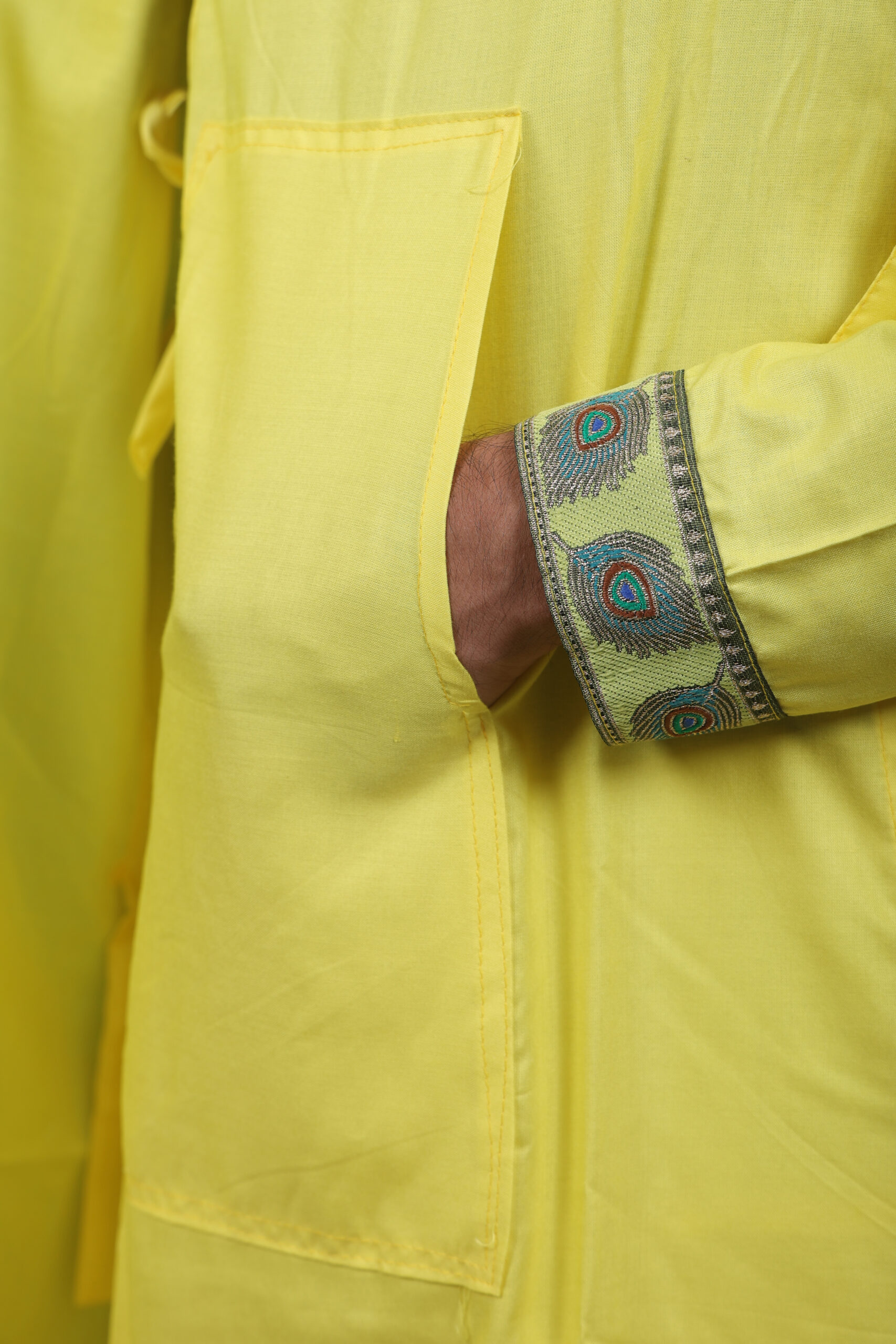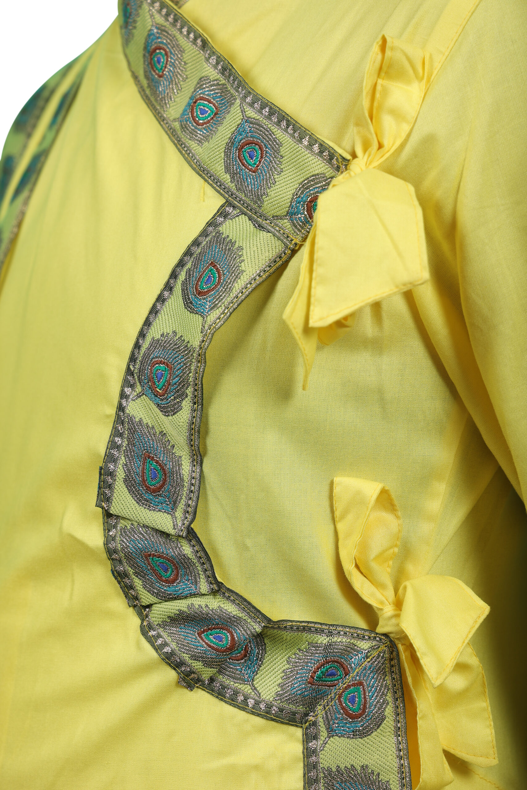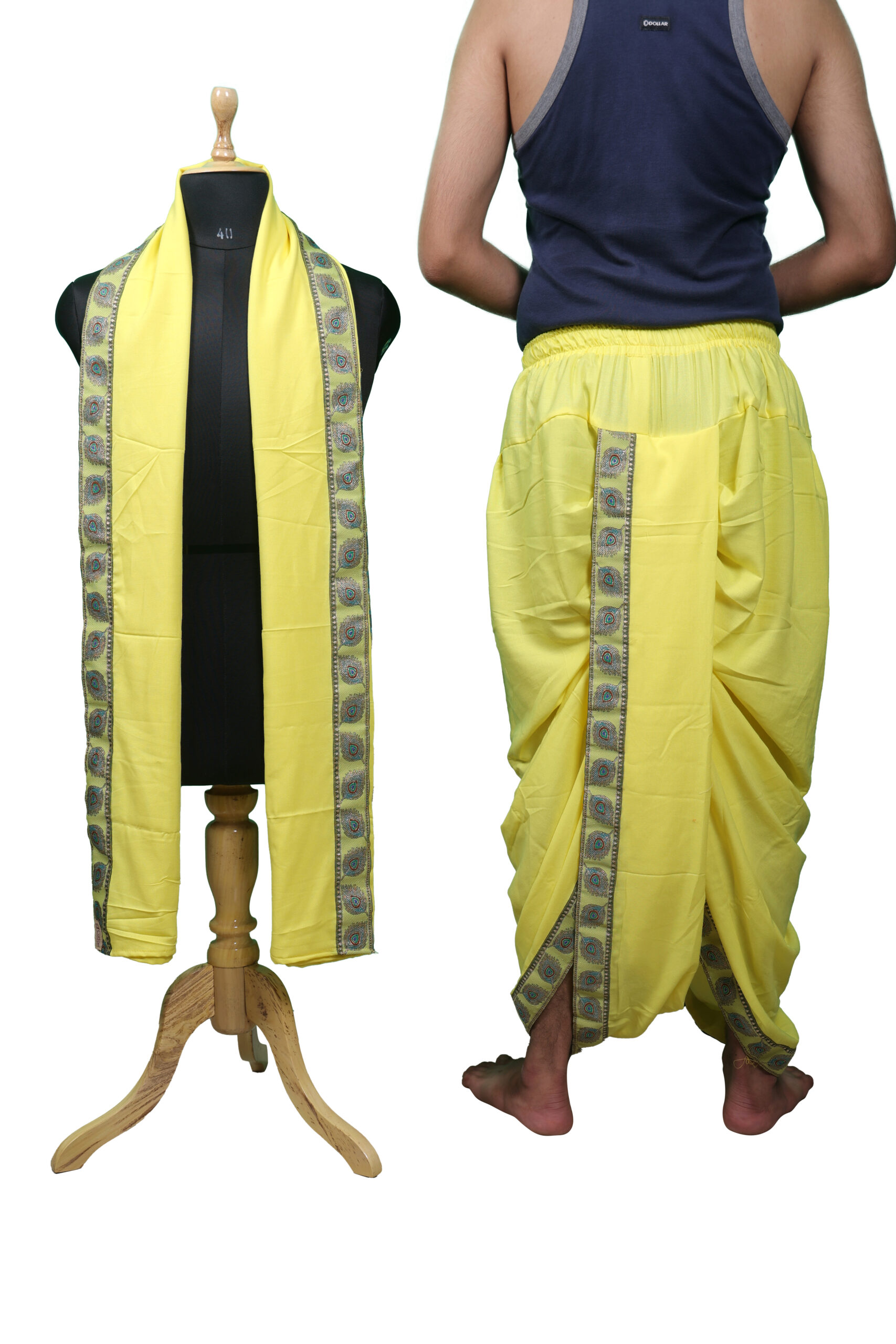 प्रीमियम भागलपुरी रेयॉन का धोती, दुपट्टा और बगलबंधी सेट, हाथ से बुने मोरपंख किनारों के साथ। हल्का, आरामदायक और पारंपरिक शिल्प का अद्वितीय संगम—त्योहारों और सांस्कृतिक समारोहों के लिए उत्तम।