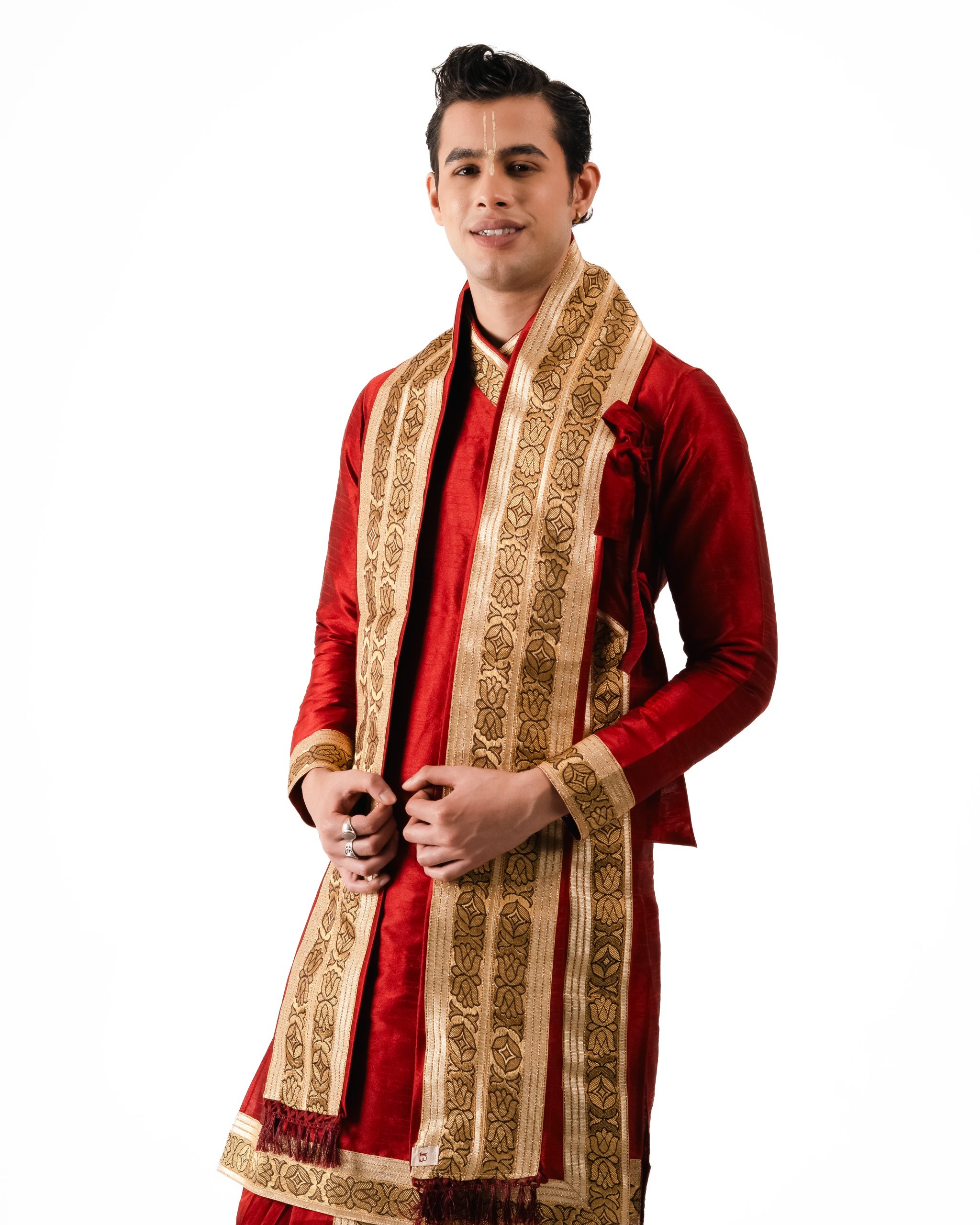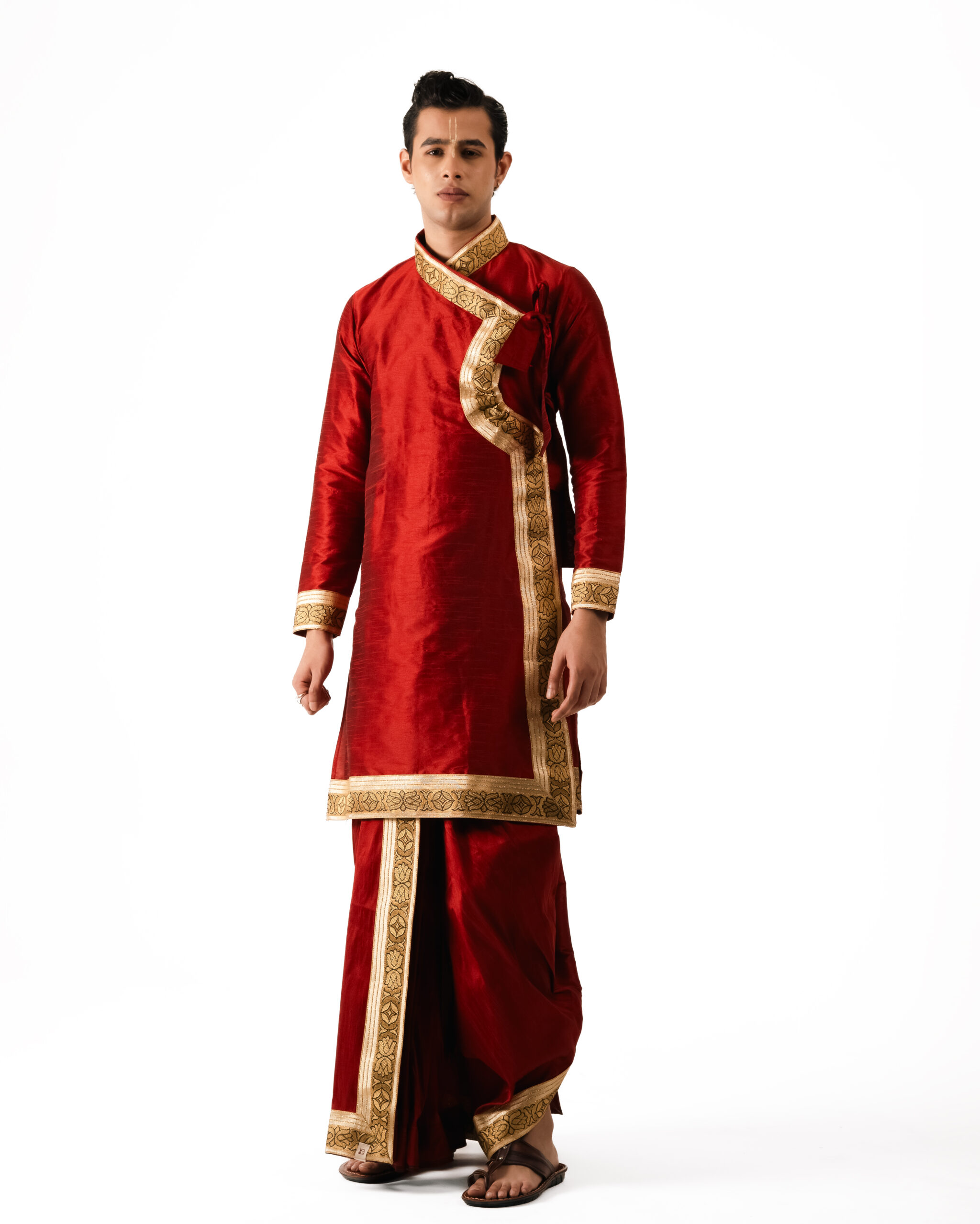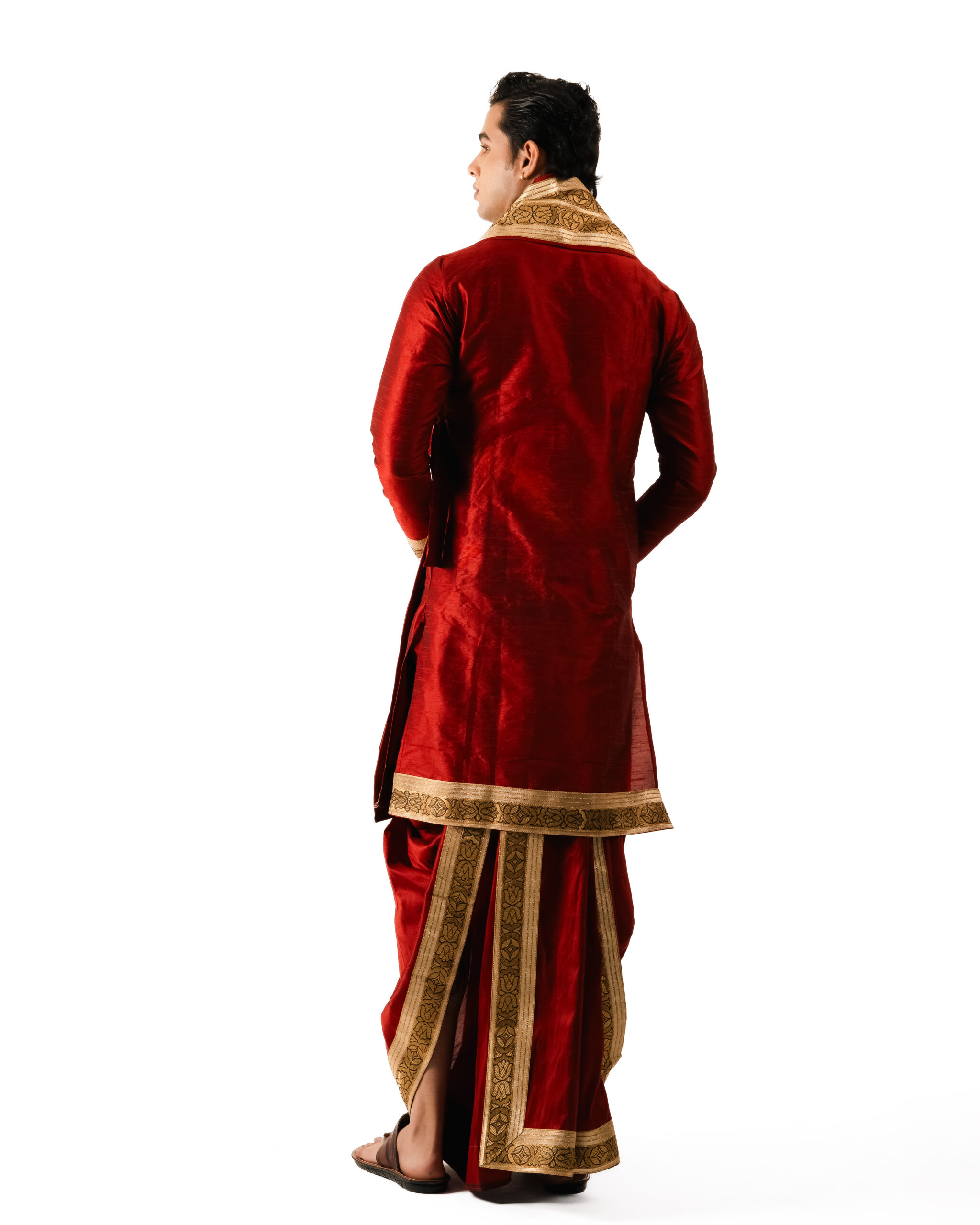The Tamra Set elevates heritage and celebration with regal elegance. Crafted from luxurious Dupian silk, its soft sheen and maroon drape evoke prosperity and tradition, highlighted by an artisanal golden zari border for a touch of opulence. The three-piece set—dhoti, patka, and structured bagalbandhi top—blends classic Indian silhouettes with modern style, reflecting grandeur in both ceremonies and festive occasions.