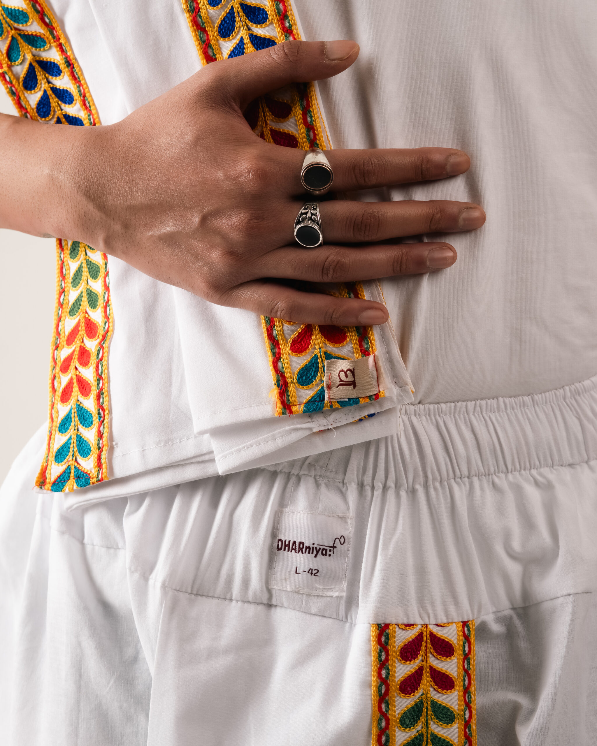 The Pavitra Set (Dhoti+Dupatta) embodies purity, craftsmanship, and radiant tradition. Woven in soft, breathable cotton, this ensemble offers comfort and graceful movement. The crisp white fabric is beautifully contrasted by a special Gujarati chaniya-choli style border, decorated with festive, ornate folk motifs. Celebrating elegance in simplicity, every border and weave showcases refined artistry. Perfect for cultural events, temple visits, or festive days, this set lets tradition quietly shine—each fold and drape echoing Dharniya’s philosophy of living heritage in motion.