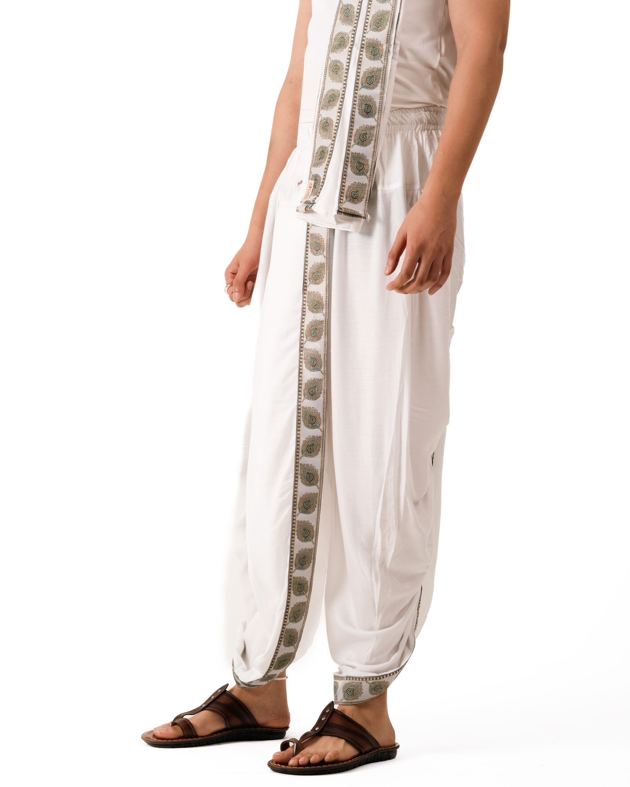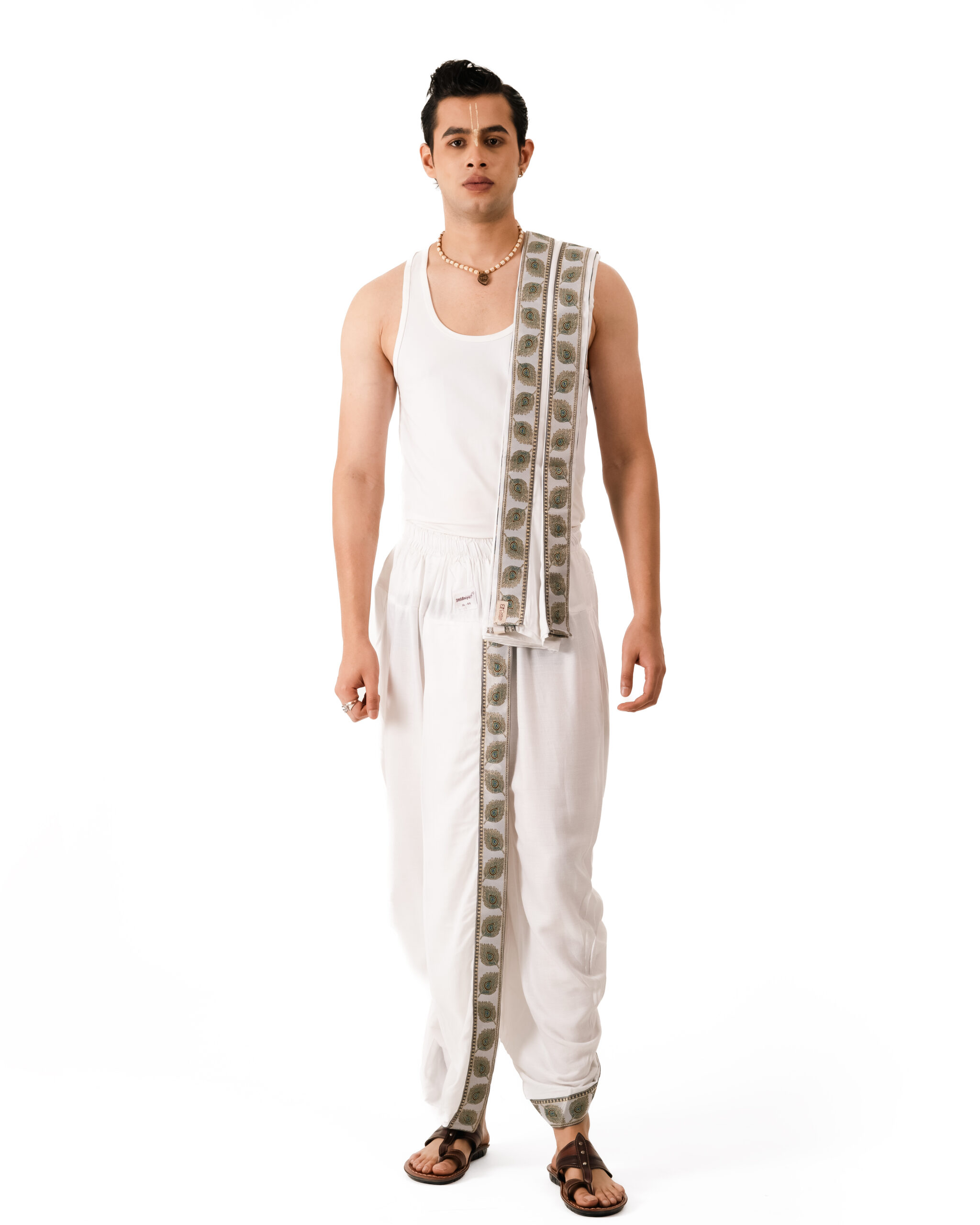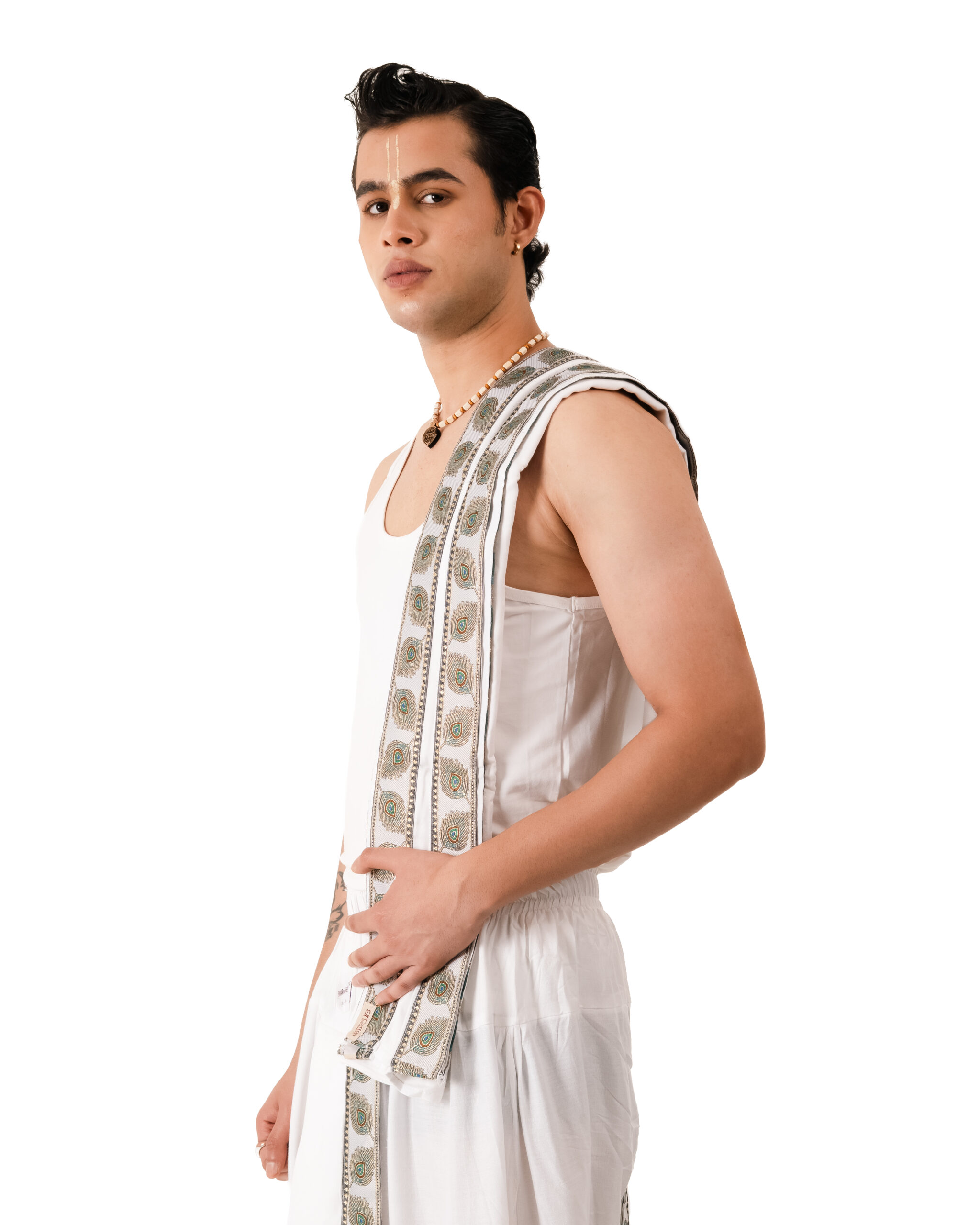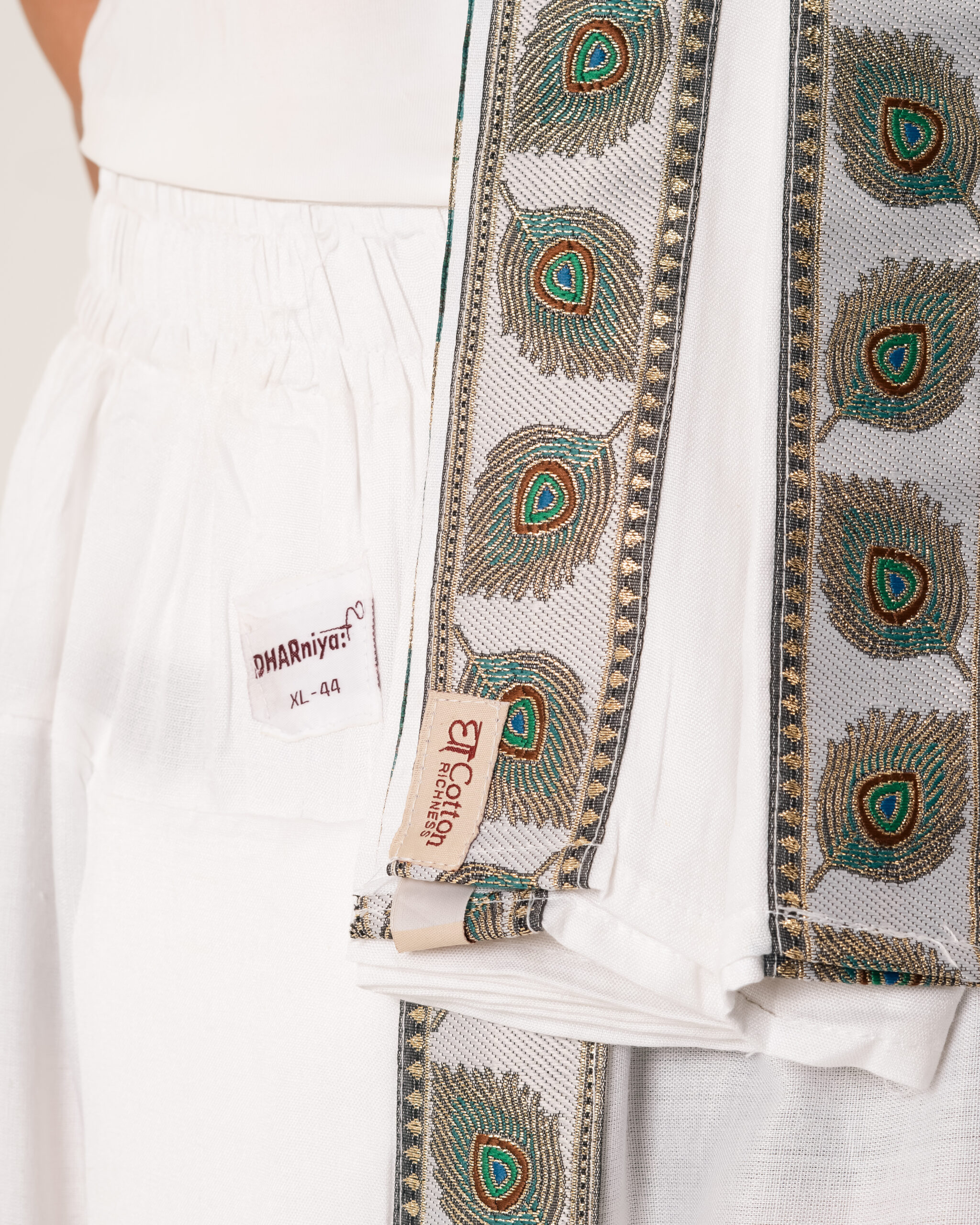 Step into tradition with unmatched grace. The Bordered Dhoti and Dupatta Set – Ceremonial Edition is crafted from premium Bhagalpuri fabric, designed for those who guide spiritual journeys and lead sacred gatherings. Featuring a dhoti and dupatta with elegant mor pankh (peacock feather) borders, this set completes the dignified attire expected of spiritual leaders and respected kathavachaks, perfect for ceremonies, Kathas, and auspicious occasions.