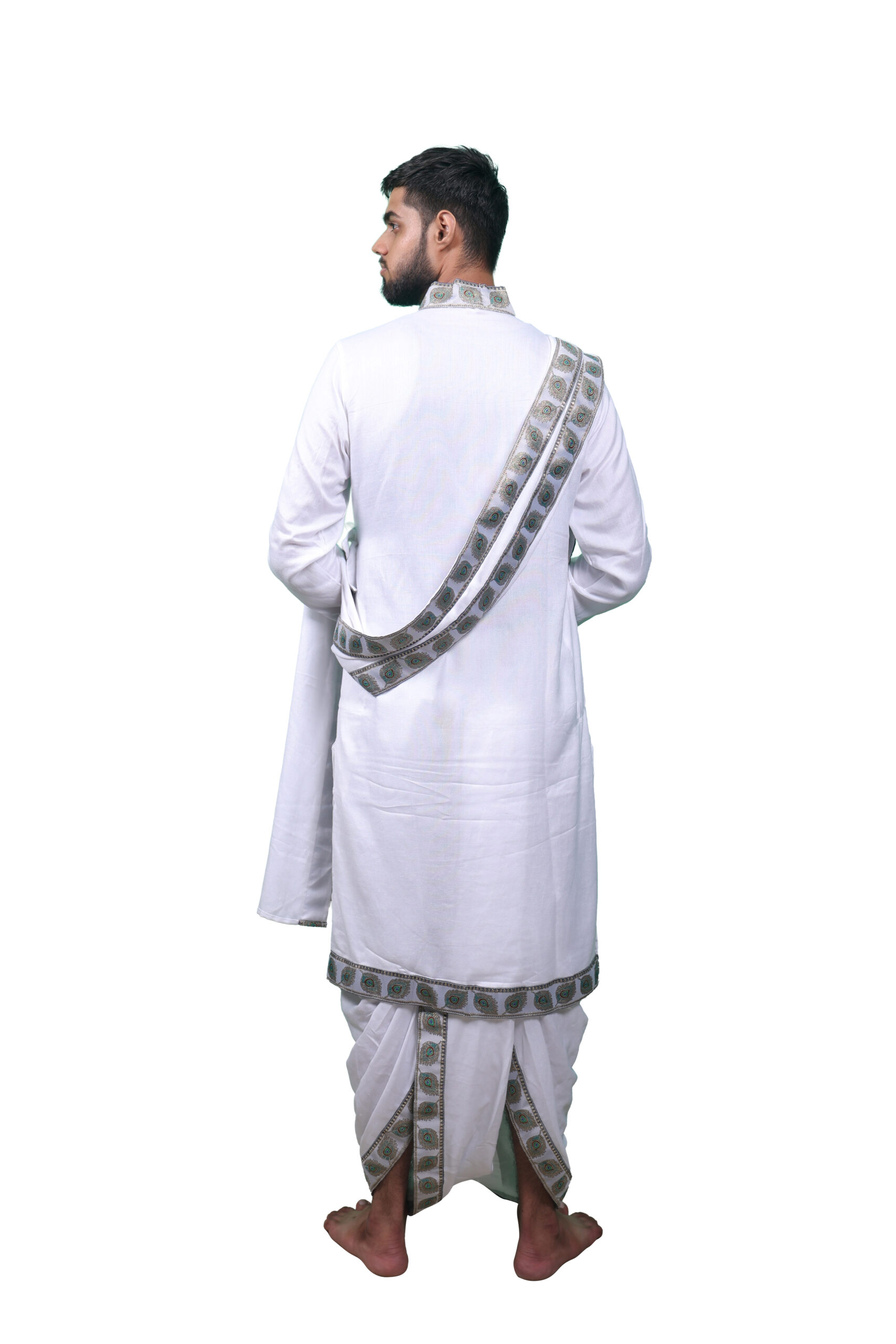 Premium Bhagalpuri rayon dhoti, dupatta, and bagalbandhi set with intricately woven peacock feather borders. Lightweight, comfortable, and a perfect blend of traditional craftsmanship—ideal for festivals and cultural celebrations.